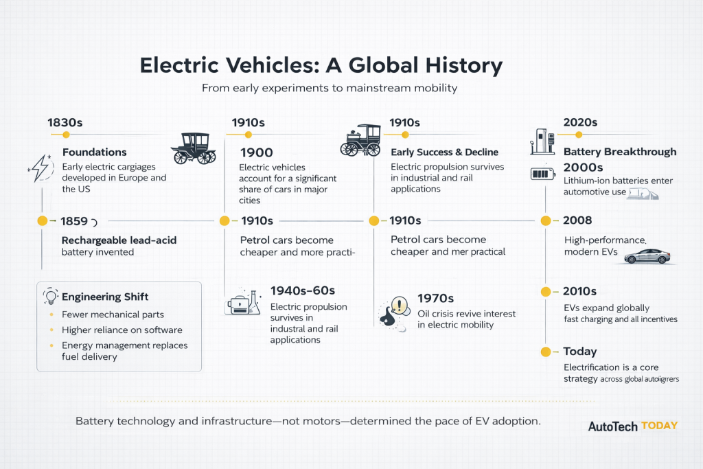 An at-a-glance timeline, showing how electric vehicles evolved from early experiments into today’s global mobility solution—driven less by motors and more by progress in batteries, infrastructure, and systems engineering.